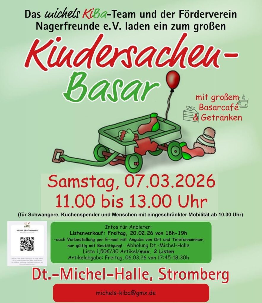 auch 2026 laden wir euch wieder herzlich zu unserem Kindersachen-Basar ein. Der Frühjahrstermin ist am 07.03.2026 von 11:00–13:00 Uhr in der Deutscher Michel-Halle in Stromberg.